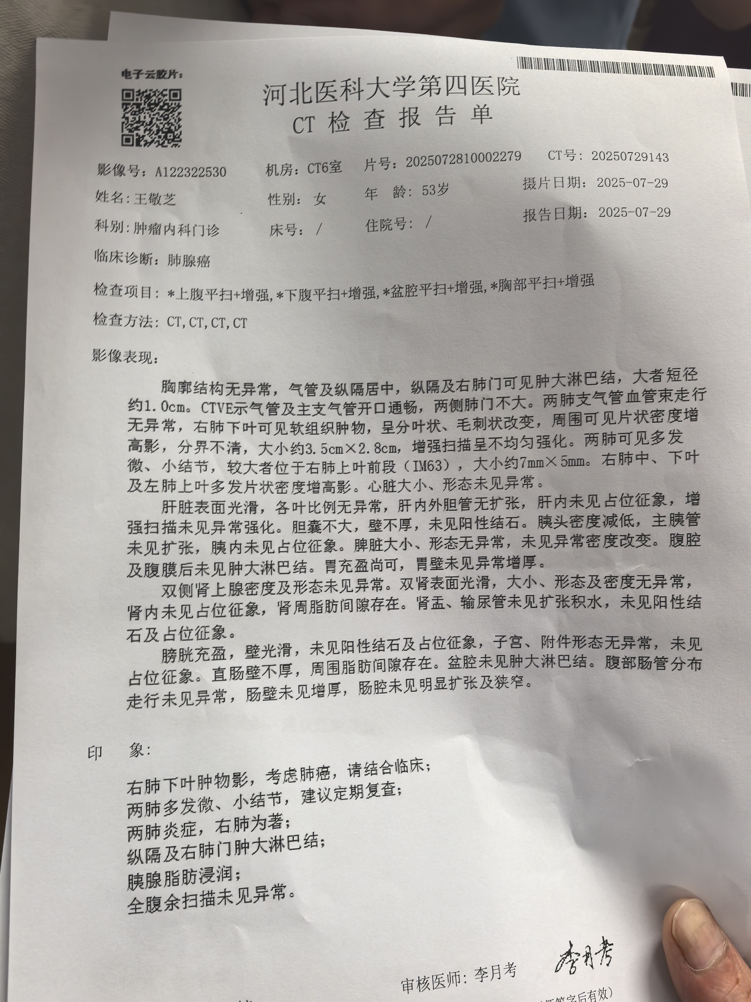 闯关3AN2 发表于 2025-11-17 10:45 嗯,好像你们诊断不明确,为什么图片上有写个3B期,那胶片看上去有炎症,是不是癌性淋巴管炎?还是什么间质性改变?如果书癌性淋巴管炎,试试免疫联合化疗吧,有效果就倒过来证明确实是癌性的,甚至,后面不排除有机会做局部治疗的机会。